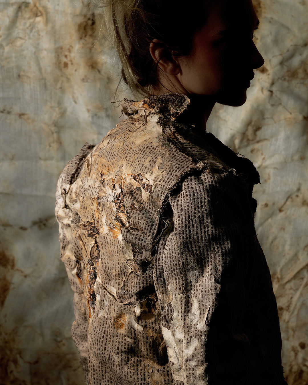 The collection provokes essential conversations around microbial design and biodegradation, prompting consumers to consider not just how their clothes are made, but how they might unmake themselves. Like our mycelium packaging that returns nutrients to the soil upon decomposition, these garments are designed with their end-of-life as integral to their purpose.