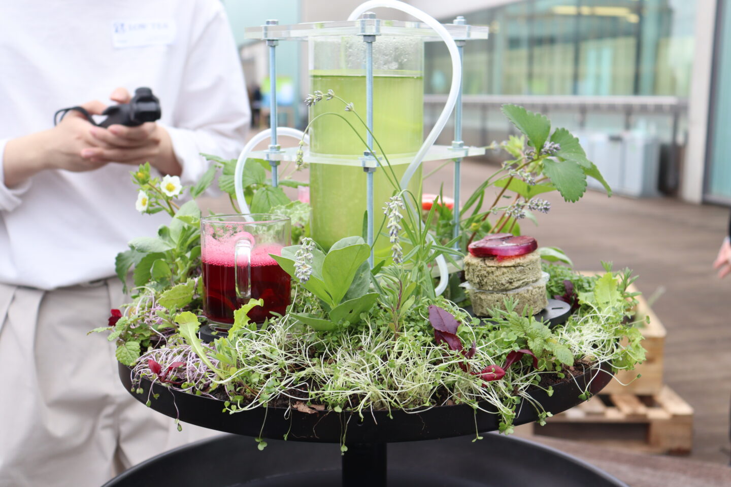 Beginning with harvesting rain and tracing the flow of water as it nourishes plants, and helps cultivate different strains of algae, the project speculated on scenarios to manage food production in the face of extreme weather. Future Harvest took place on Thursday 30th May, on the Central Saint Martin’s Roof Terrace, where guests were invited to an immersive guided presentation of culinary experiments ranging from mobile mushrooms to algal teas, cryo-therapuetic sorbets, and microbial mists.