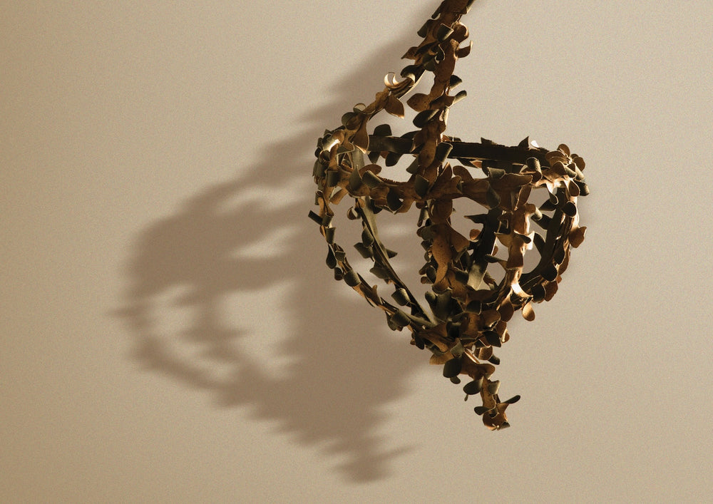 Payonke captures this seasonal intelligence. These bio-responsive mobiles contain Bacillus subtilis spores, probiotic bacteria naturally found in healthy soil. Each piece acts as a living sensor, curling and shifting with humidity changes, much like autumn plants responding to their environment.