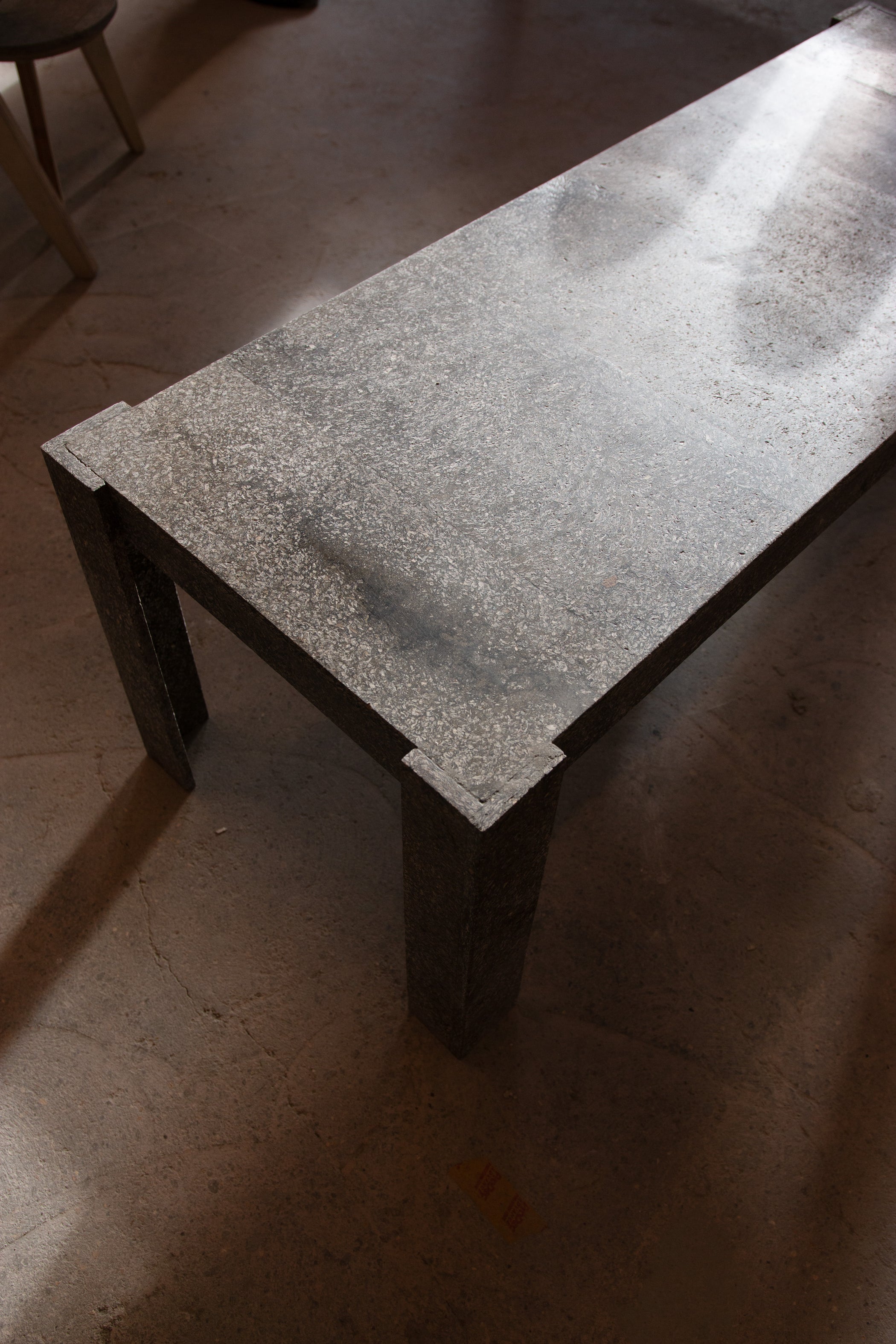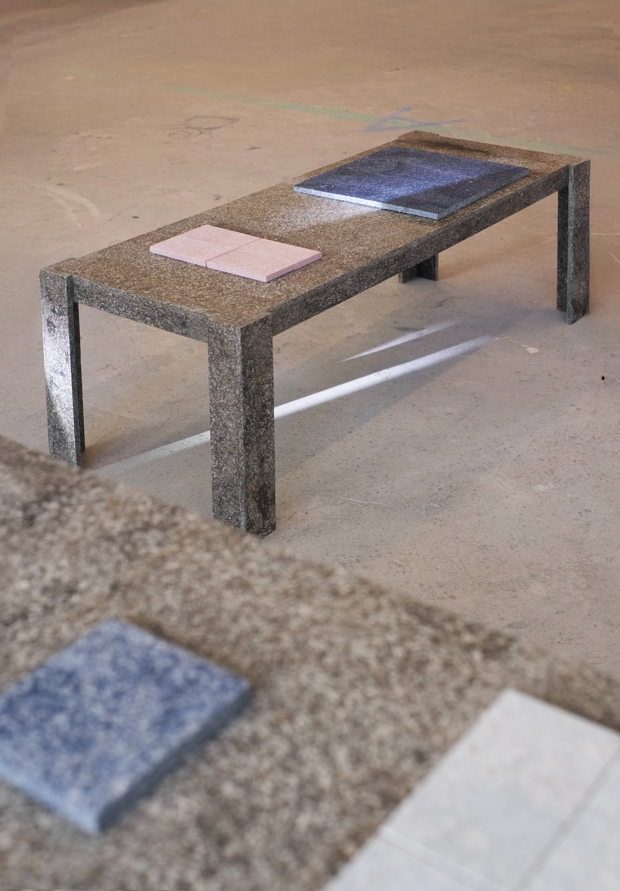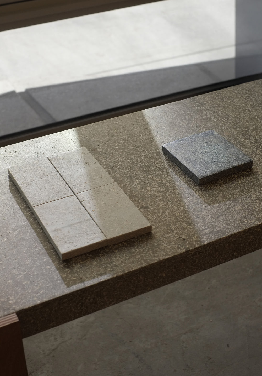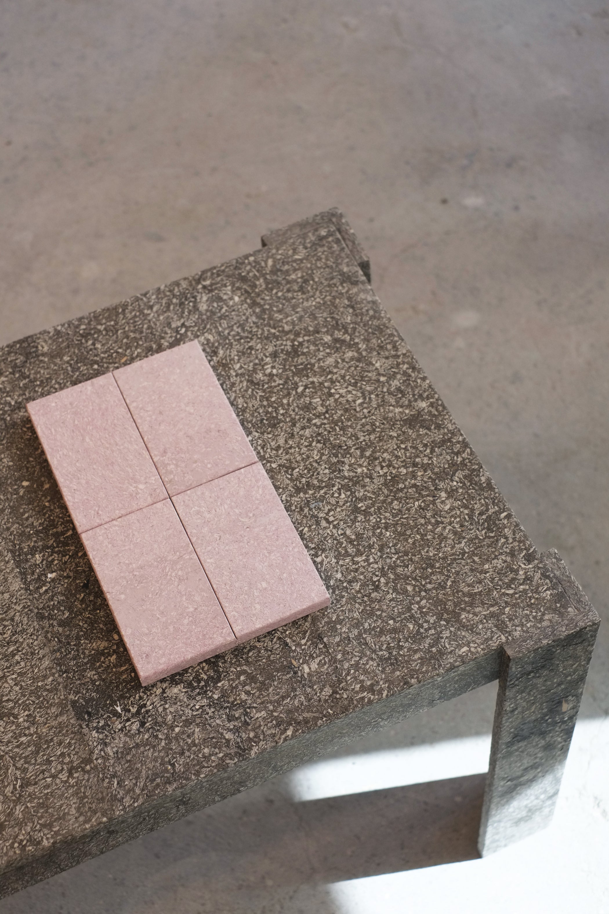 The cups are shredded and sterilised, returning them to a paper pulp state. This pulp is bound with a plastic-free binder to create a composite material that behaves structurally like medium-density fibreboard whilst maintaining stone-like tactile properties.