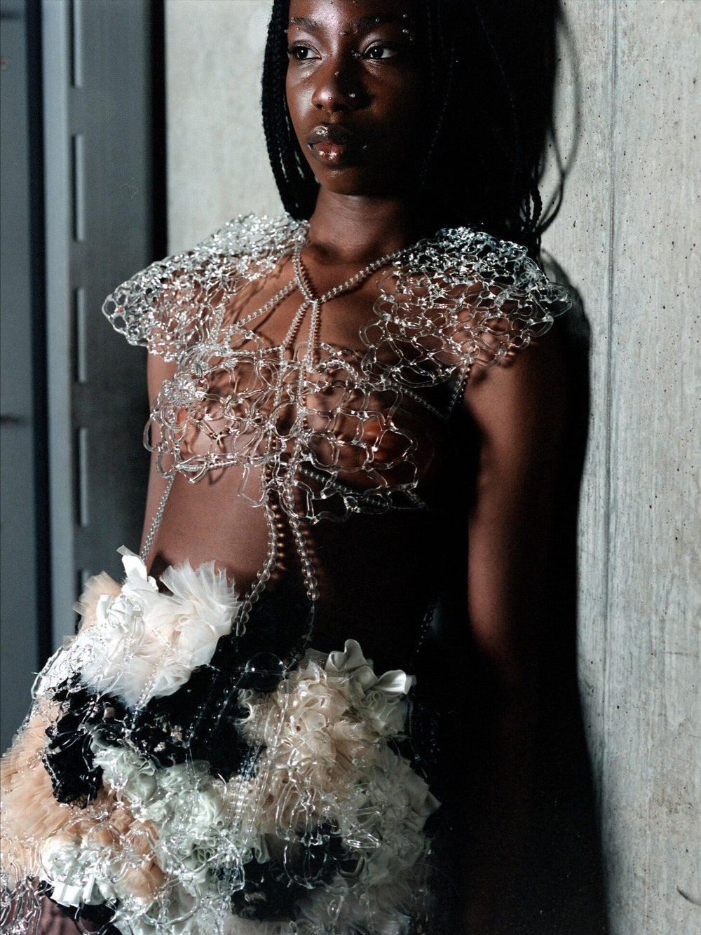 Fashion designer Thea Si Xu draws inspiration from this age-old practice, repurposing discarded fishing nets into something entirely novel. By collecting hundreds of metres of these old nets, Thea began a metamorphosis that mirrors the transformative processes observed in nature. Through careful hand-sewing, beading, and pleating techniques, these once-practical tools become delicate fabric designs. The resulting garments stand as a testament to the potential of upcycling and finding beauty in repurposed materials.