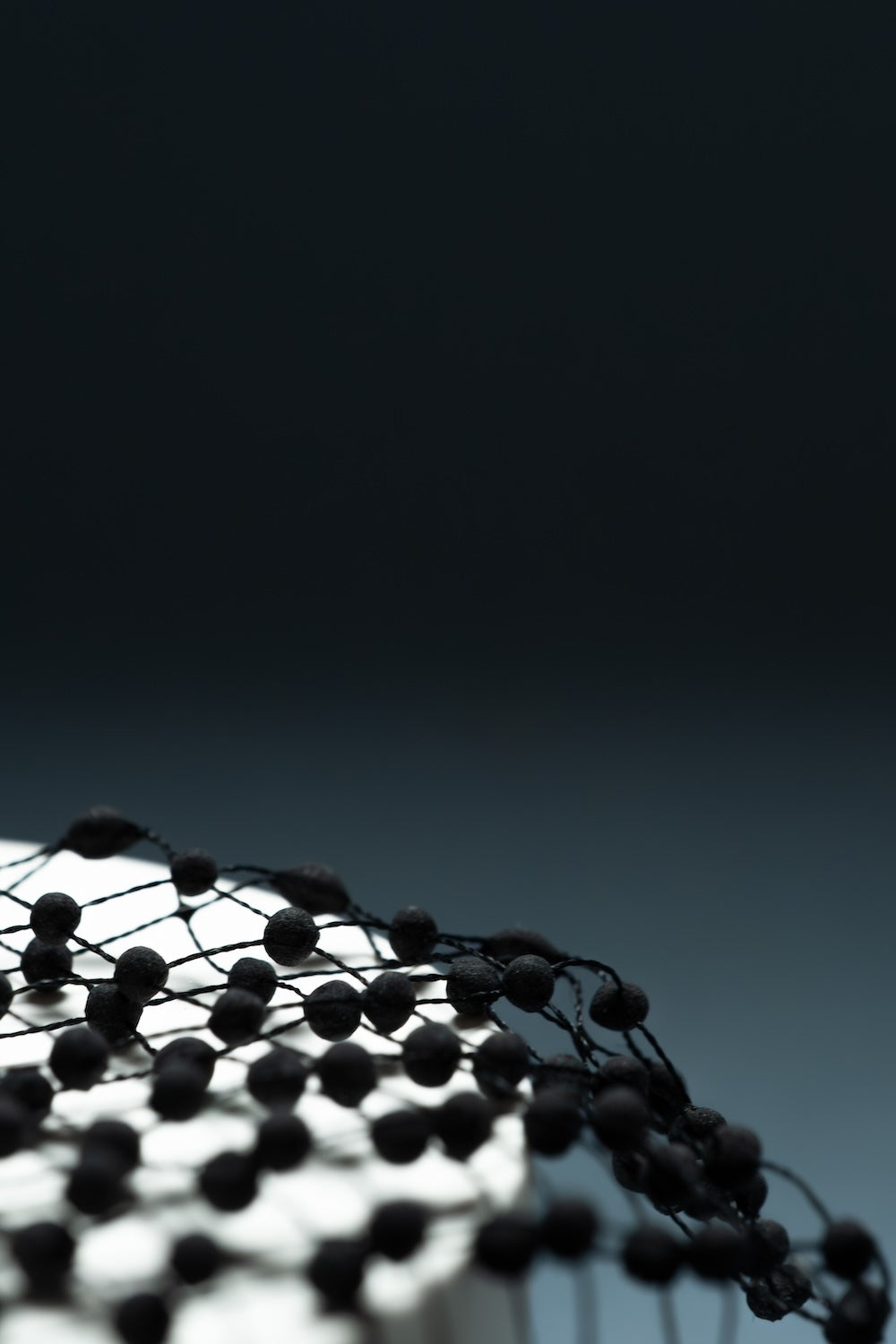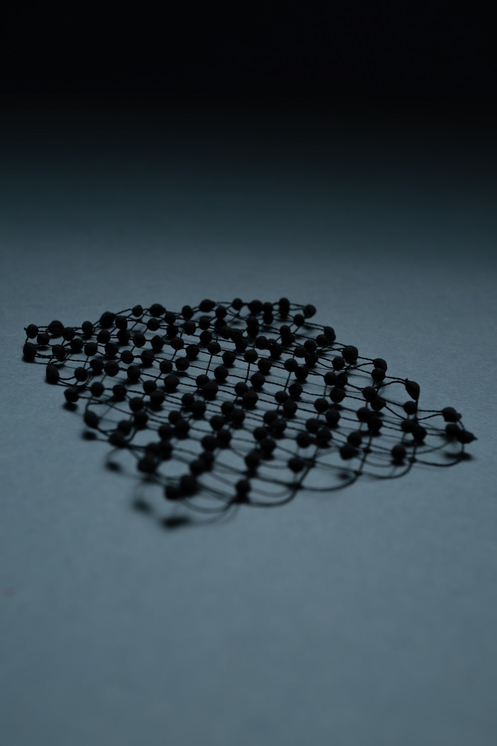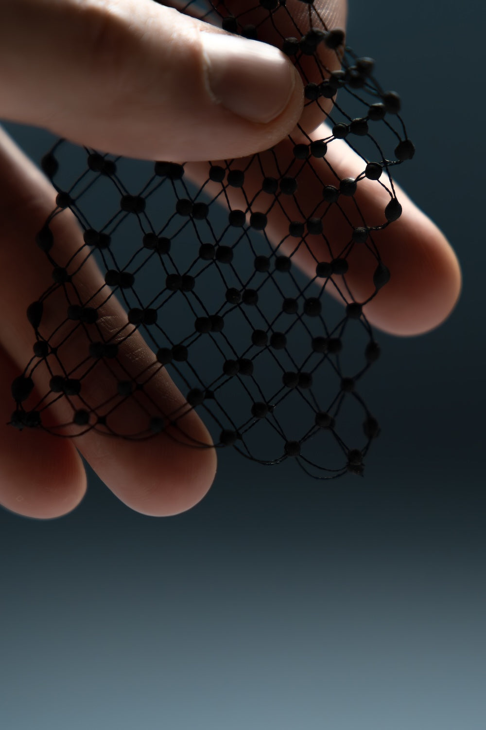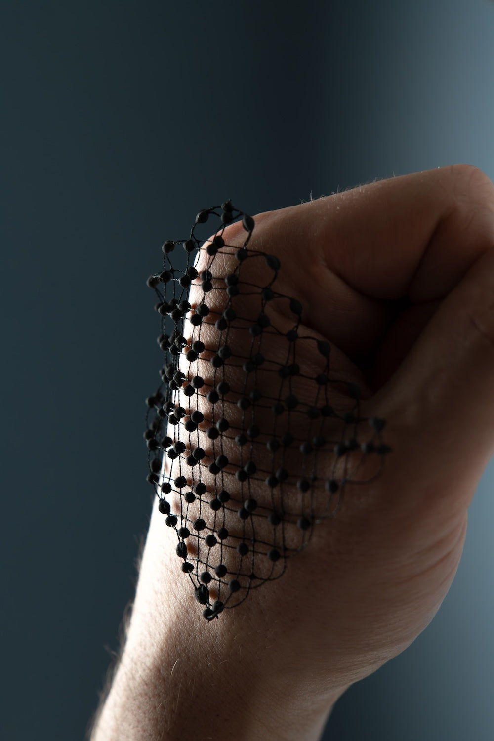 The fabrication journey proved as innovative as the material itself. Cellsense designed custom 3D-printed looms and adapted their robotic deposition system to lay the biopolymer beads (seaweed, cellulose and charcoal) directly around a threaded grid, eliminating the repetitive manual assembly that would have made production unsustainable. As the biopolymer crosslinks, the beads naturally secure onto the textile structure—creating two sides that are then seamed together to form the final exfoliating pad.