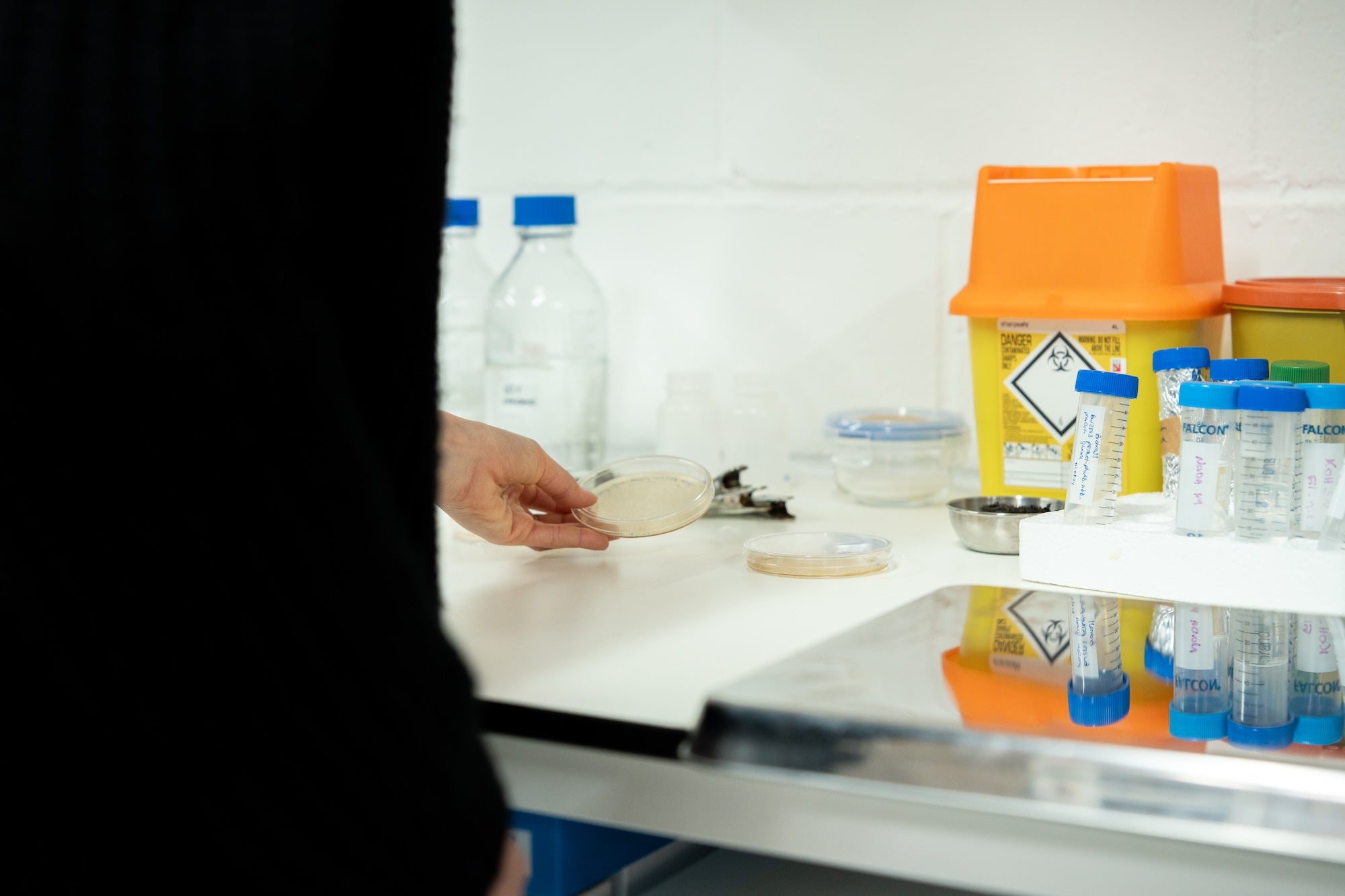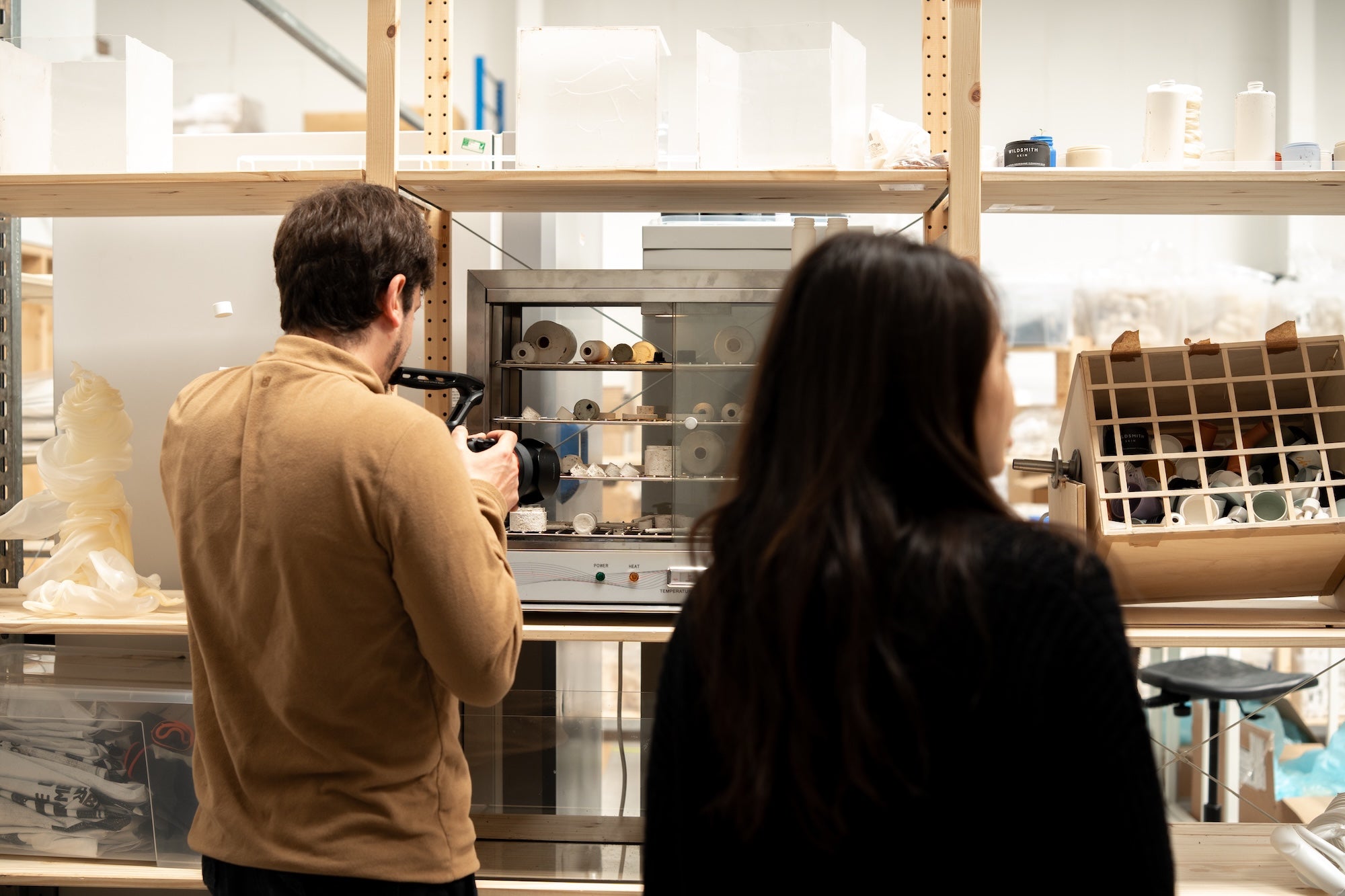 Our visit began in their laboratory—the core of their operation. Here, we observed the relationship between carefully cultivated bacterial strains and material development. The team demonstrated how different bacterial strains produce materials with distinctly varied properties in a fermentation process, from flexible to structurally rigid compositions, each with unique tactile qualities.