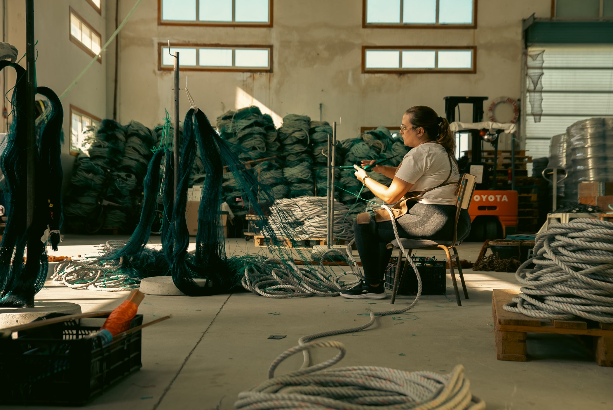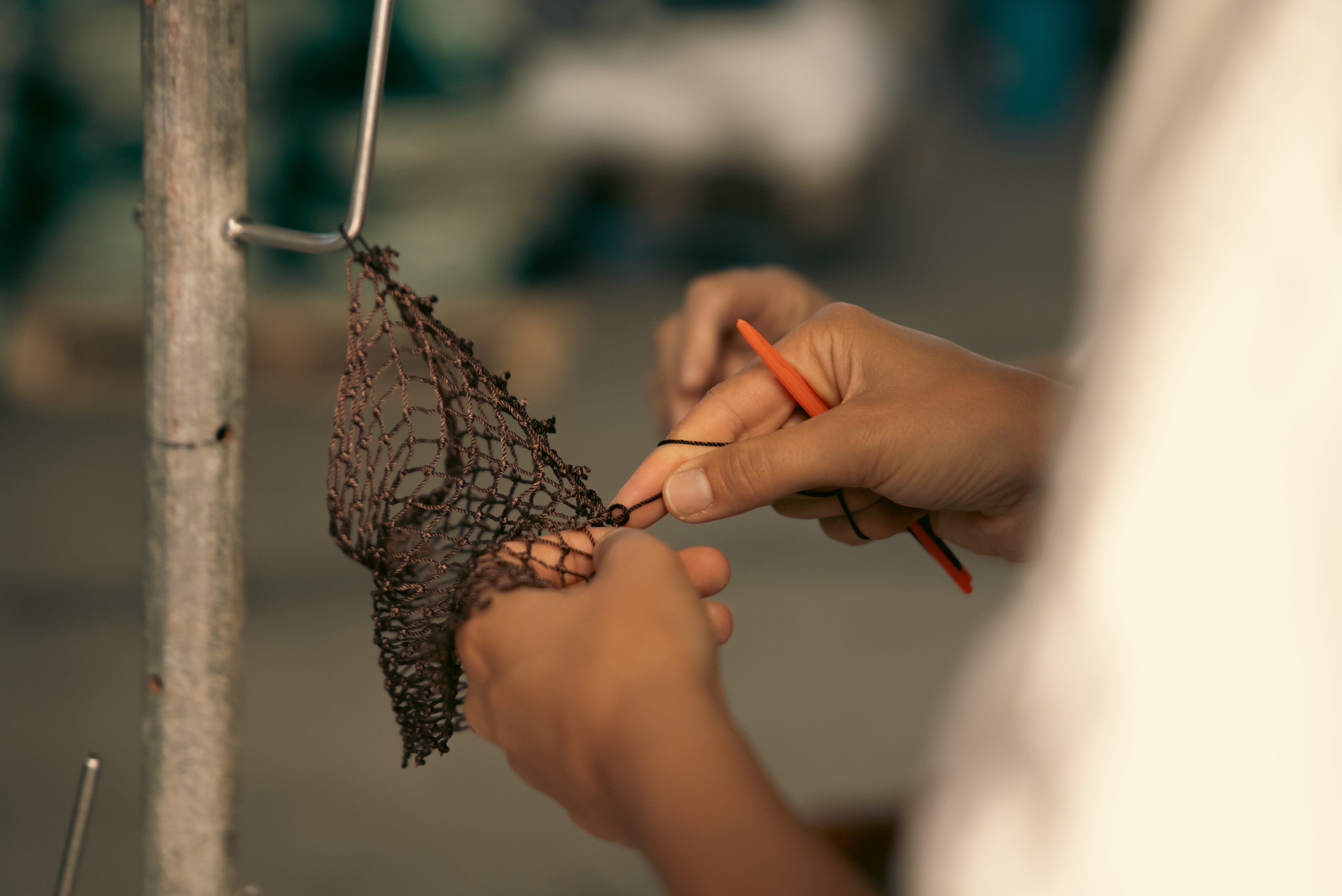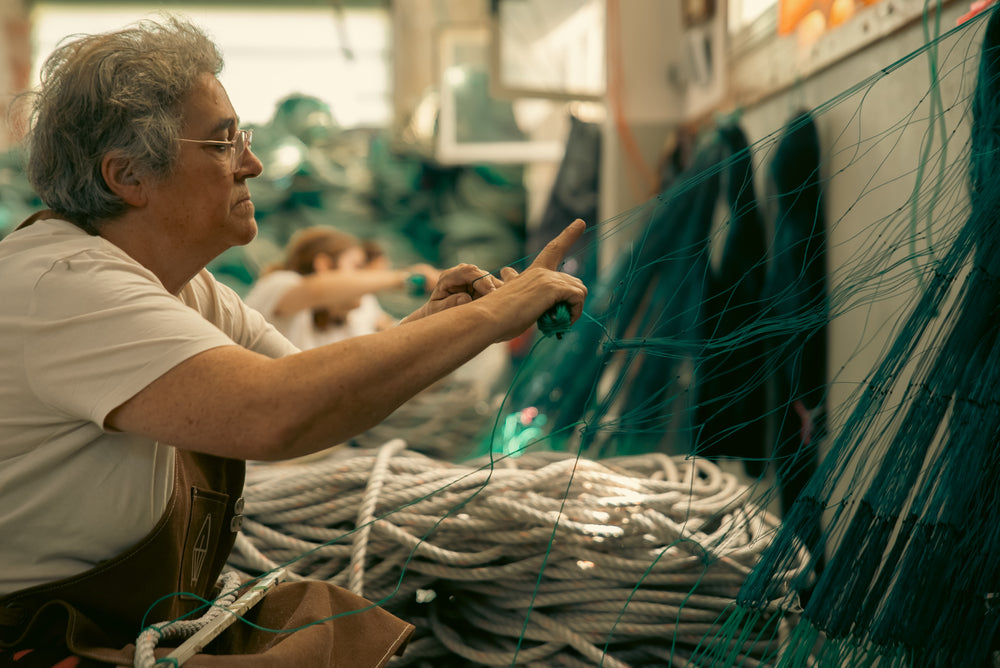 Through Proxecto Bolina, Amalia collaborates mostly with the redeiras; women net-makers who have long been vital to the fishing industry in A Guarda. Though their craft has historically been undervalued, it is their skilled hands that keep the fishing economy afloat. Yet, like many artisanal crafts, net-making is in danger of disappearing. Younger generations are no longer taking up the trade, and with that, an entire cultural practice stands at the brink of extinction.