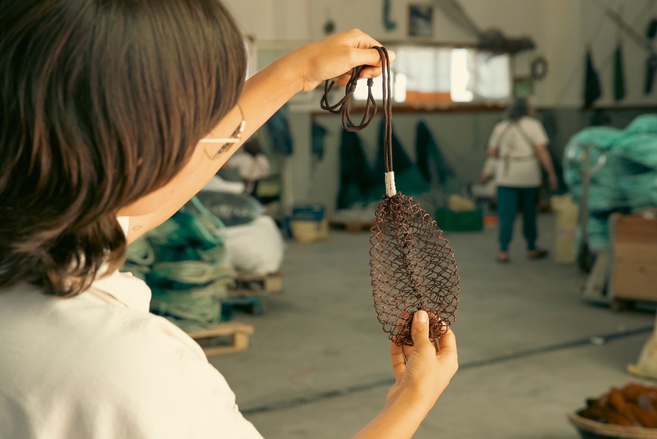 This philosophy also guided her collaboration with us. Our shared values: care for surroundings, transparency, resilience and authenticity, made the partnership feel organic. Together, we created a bag using warm brown nylon nets found in Galician ports, selected for their texture, tone, and resonance with traditional fishing materials. Although nylon revolutionised net-making in the 20th century, bringing efficiency and scalability, this project circles back to the intimate, tactile essence of the craft.