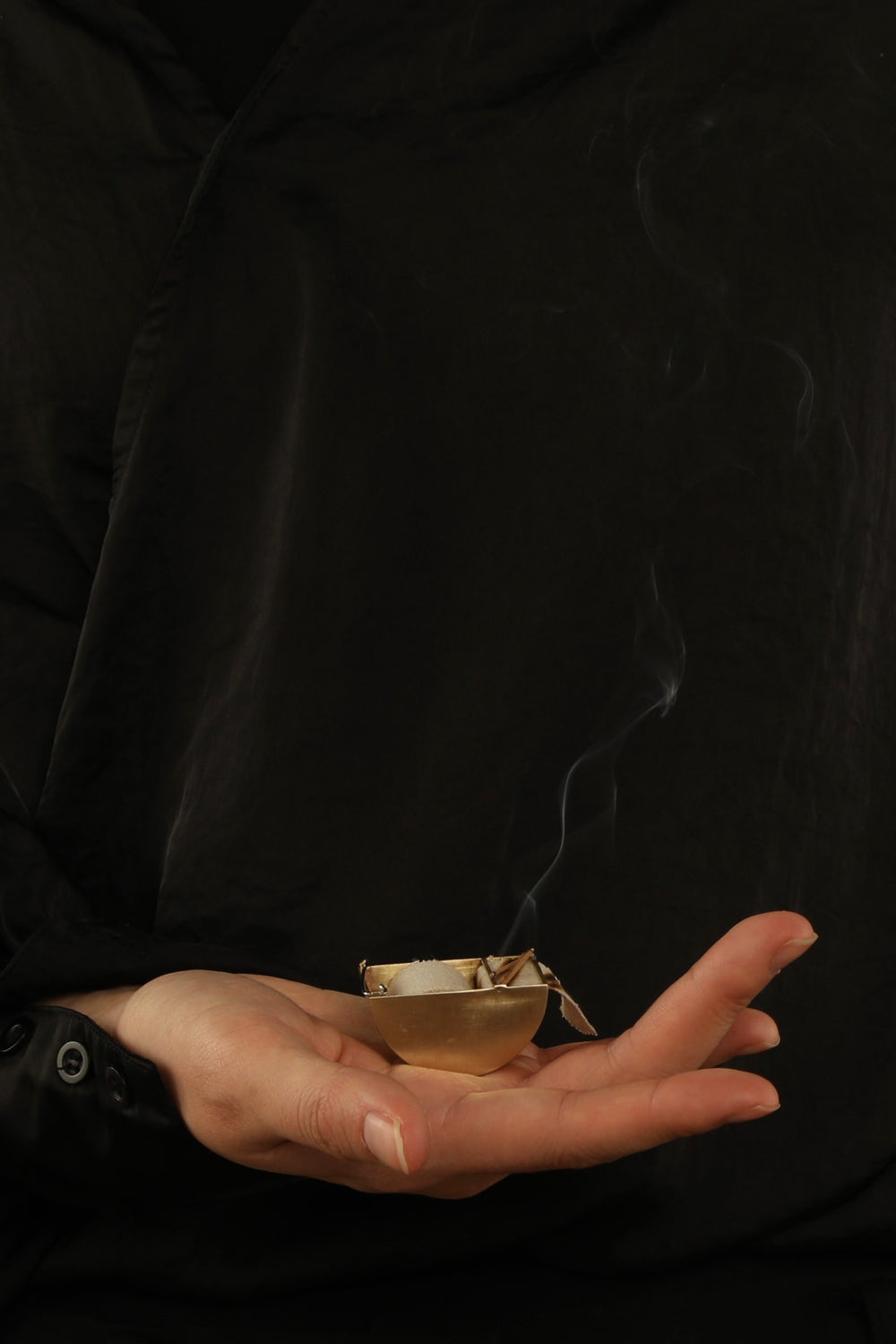 Crafted in brass and richly adorned metal, each piece serves as both jewellery and incense holder. The material holds particular significance—as incense burns against the metal surface, its oils subtly alter the colour of each piece. Over time, these gentle changes accumulate, with each burning ritual leaving its mark, allowing the metal to develop a unique character that captures personal moments.