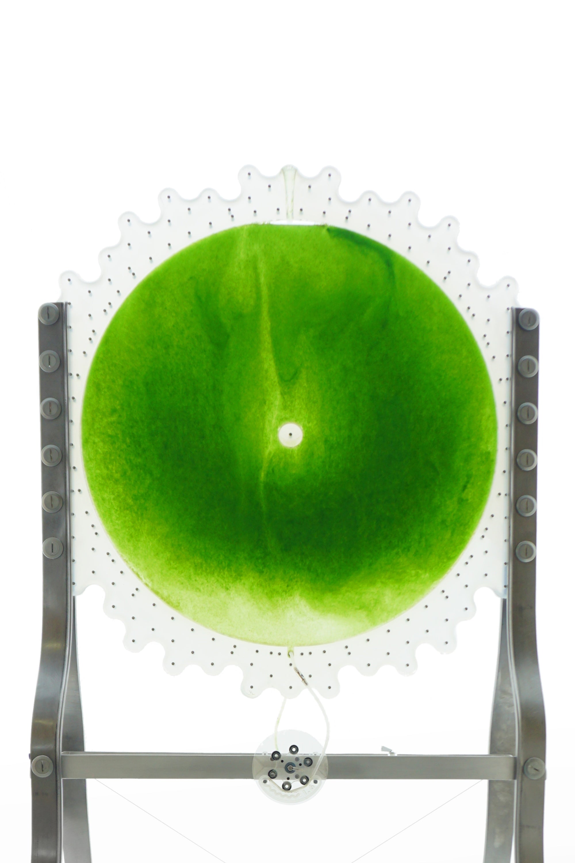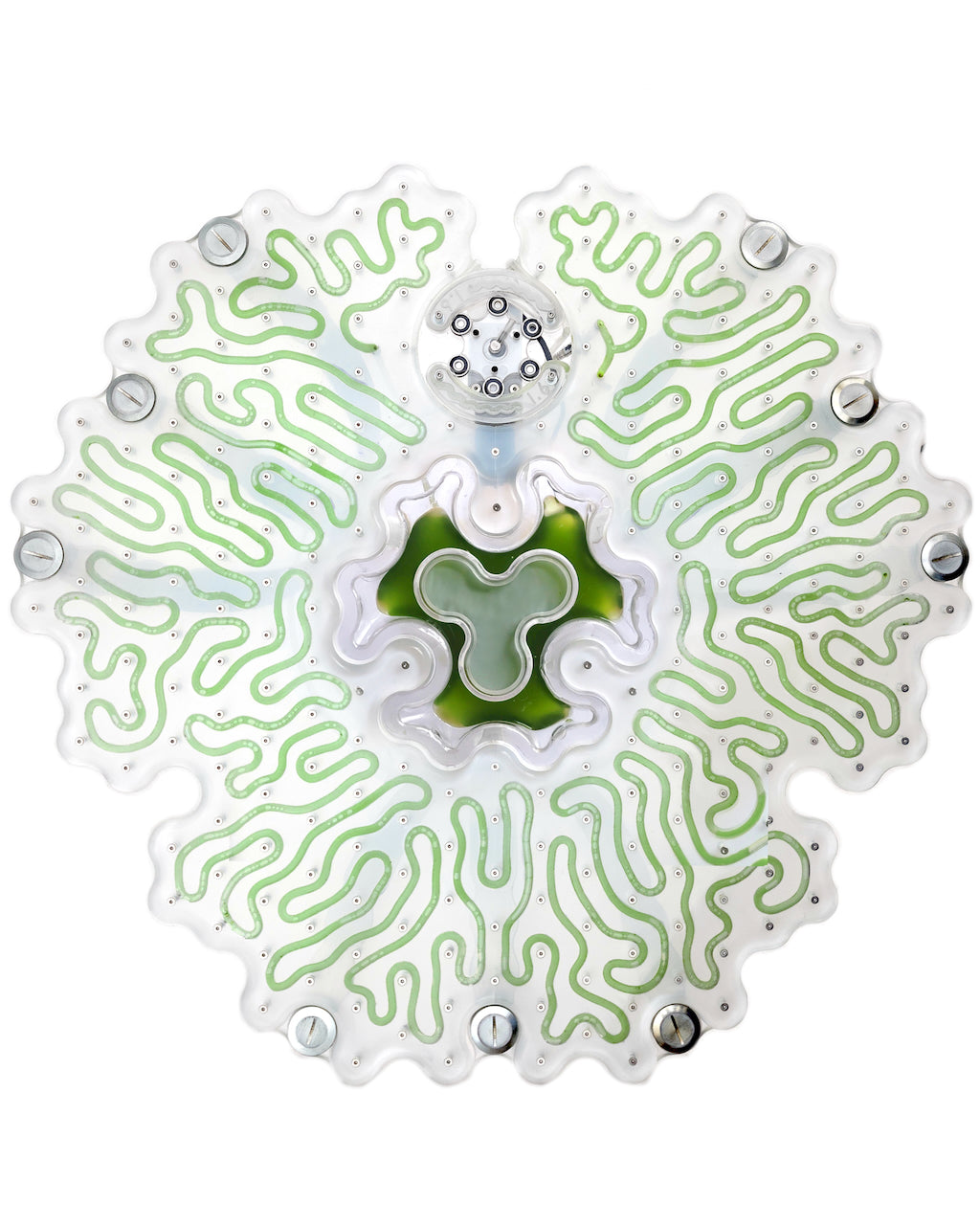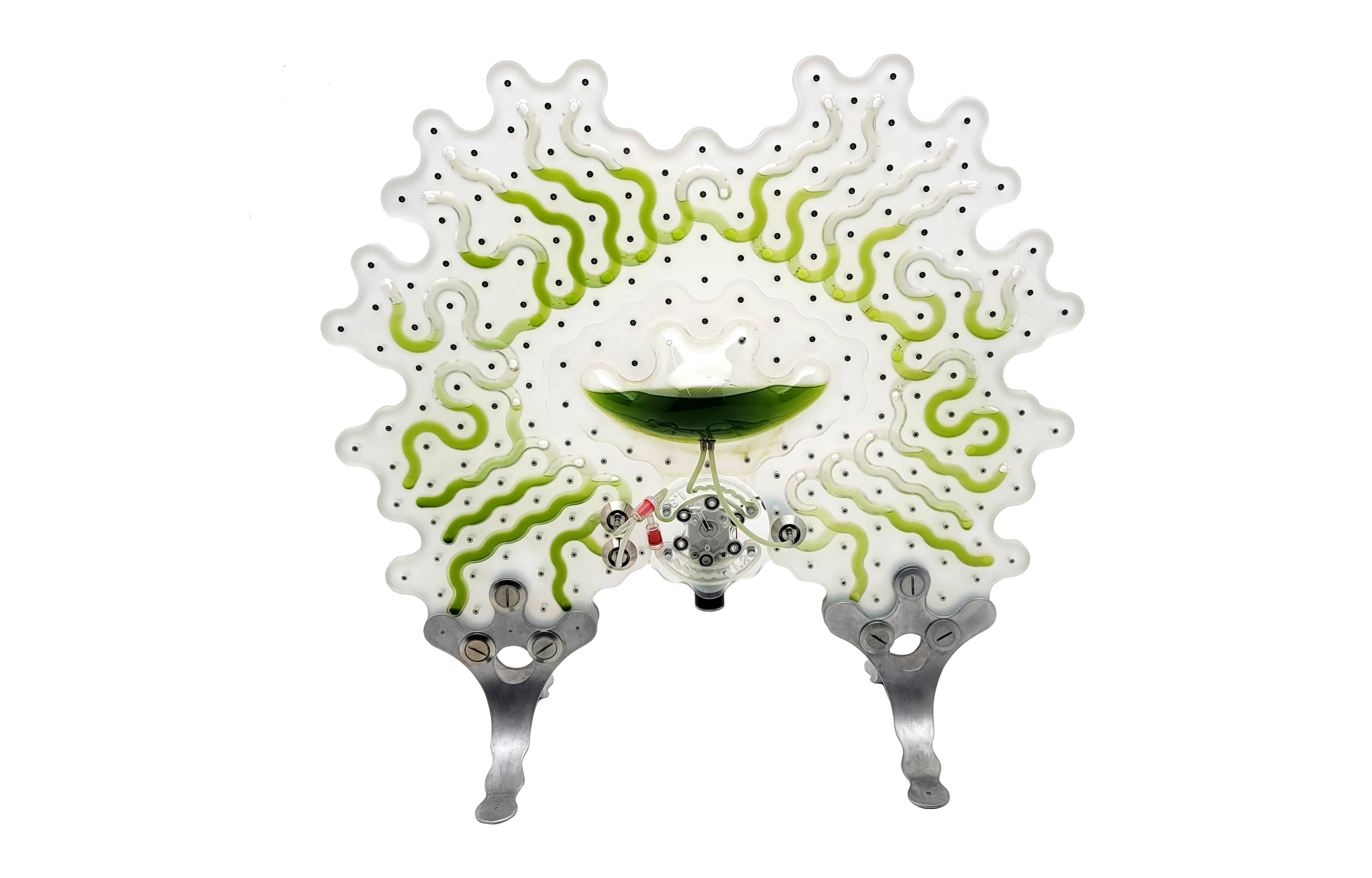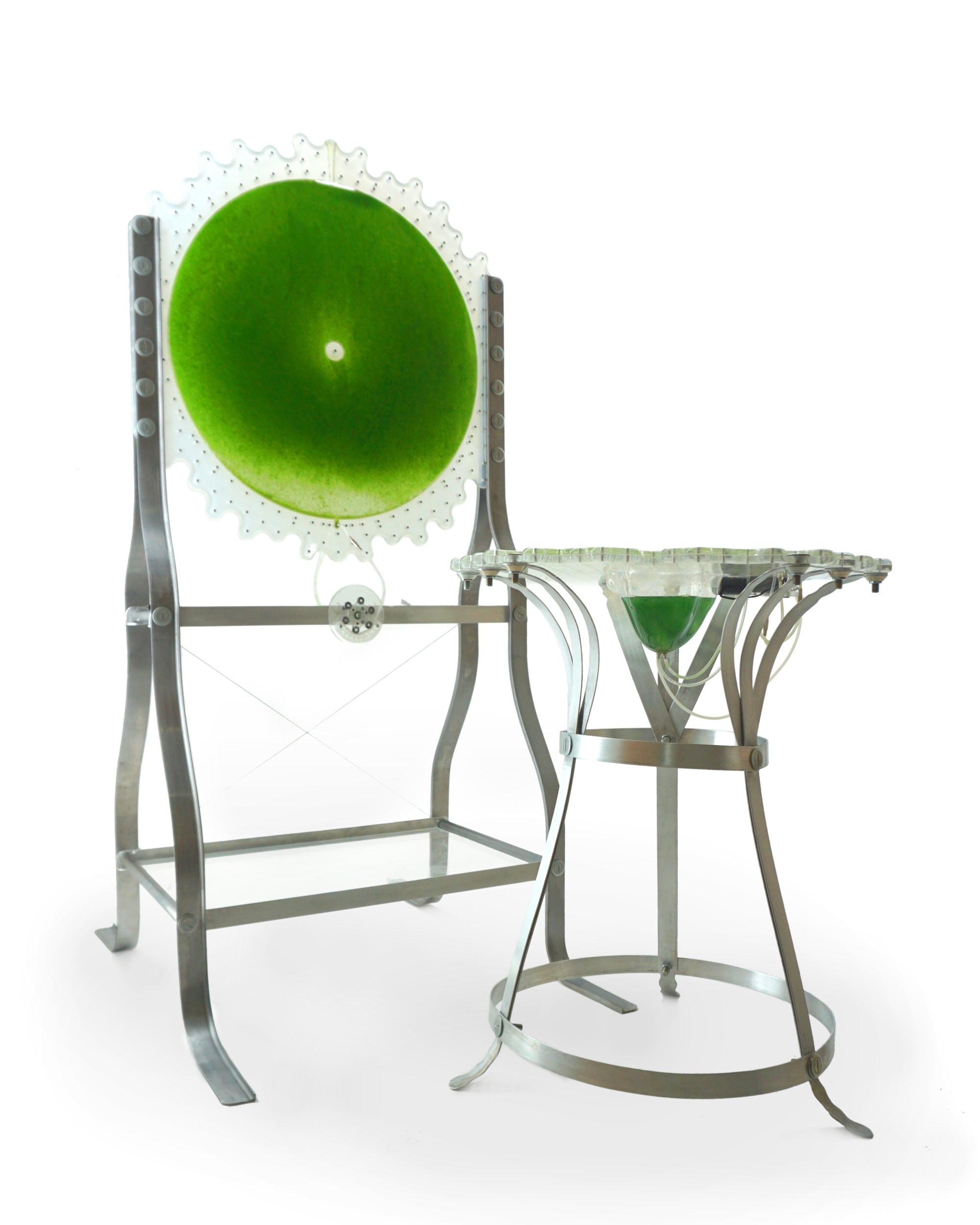 “The micro world Spirulina inhabits is full of diverse yet simple geometric lifeforms which I celebrate through the cellular forms of each algae panel silhouette. I wanted the pieces not only to function as microalgae farms but also to communicate visually the active process of photosynthesis which the algae are constantly performing.”