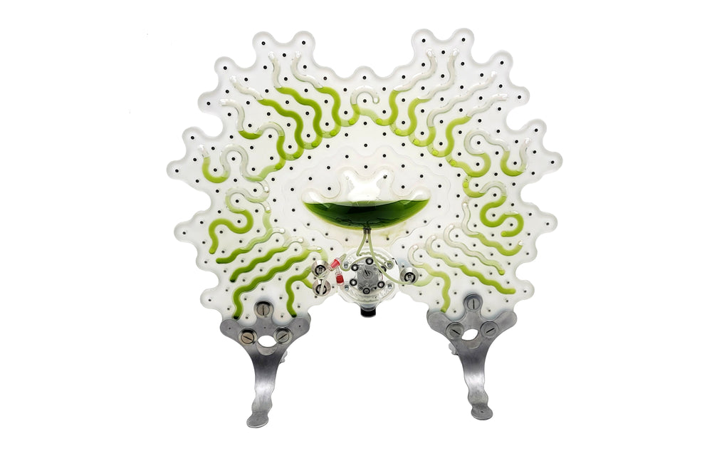 Symbio-Screen Symbio-Screen emerges as a living sculpture that envisions a potential future where humans coexist symbiotically with carbon-consuming cyanobacteria, reimagining our built environments as dynamic, breathing ecosystems.