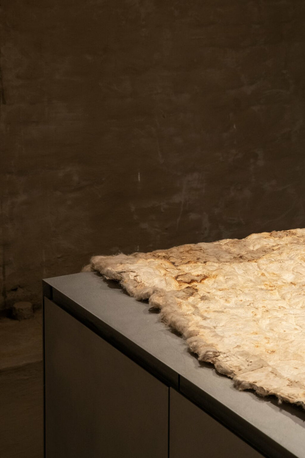 Dasha Tsapenko, a Dutch-based Ukrainian-born artist who crafts textiles and art pieces from earth-grown fibres. Collaborating with scientists, farmers, and artisans, Dasha’s project, MYC_Carpet, combines handspun hemp yarn with fungal spores which provides this piece with its strength, function, and versatile nature. The stability that hemp fibres offer allows Dasha’s creations to be easily decomposed back into the soil, reducing methane emissions and enriching the soil to encourage further growth. Through her work, Dasha highlights the importance of co-creating with the environment and local communities.