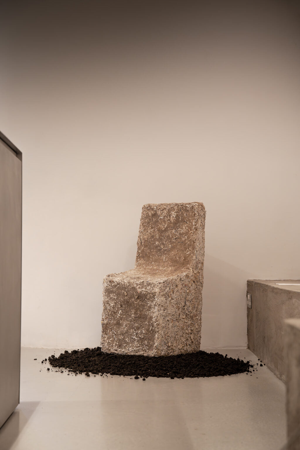 Aléa, a Parisian-based material research design studio founded by Miriam Joshi and Stella Lee Prowse. Aléa explores post-industrial methods by fabricating with mycelium—the root system of fungi—relinquishing control to let nature take its course. Their piece Dirty Chair No.4 is part of the ‘Back to Dirt’ project, incubating products in soil using locally sourced Parisian fungi roots and waste papers from Parsons School of Design. This conscious approach feeds back to the earth during decomposition, enriching the undergrowth. Aléa’s process embodies the phrase, “you are a product of your environment,” unearthing the role of ecosystems beneath our feet.