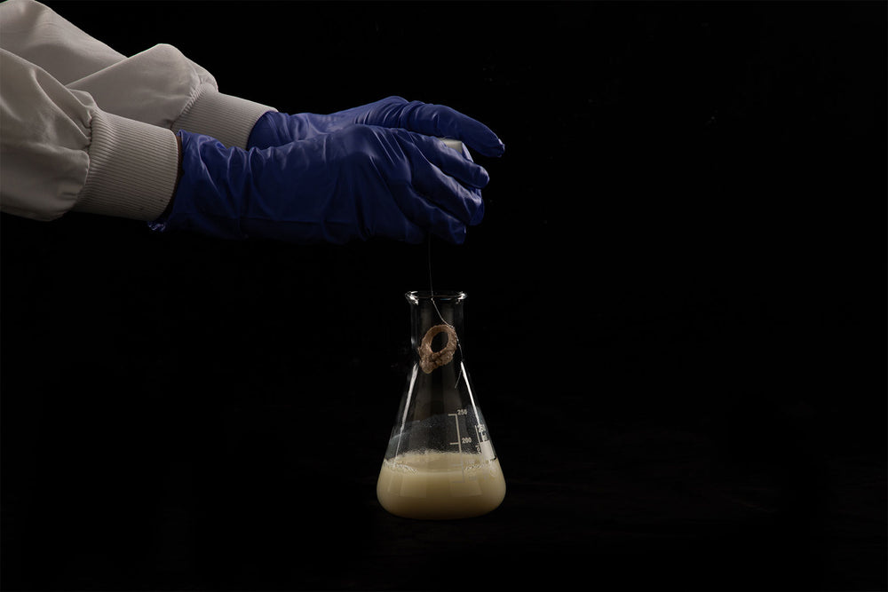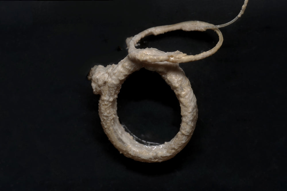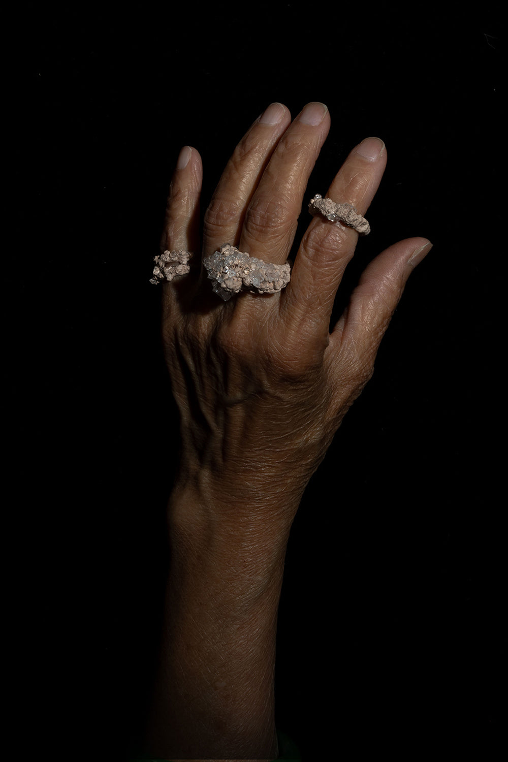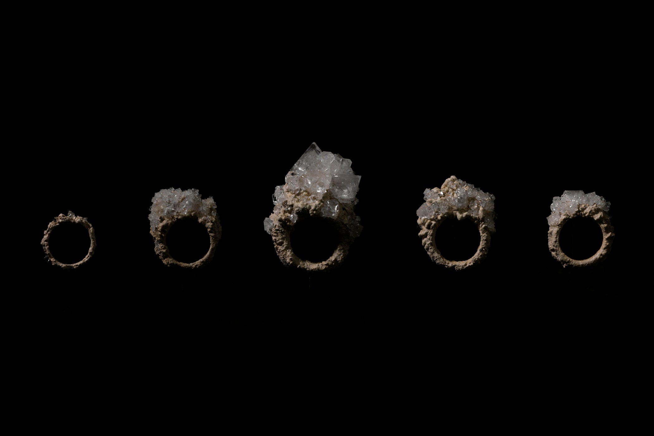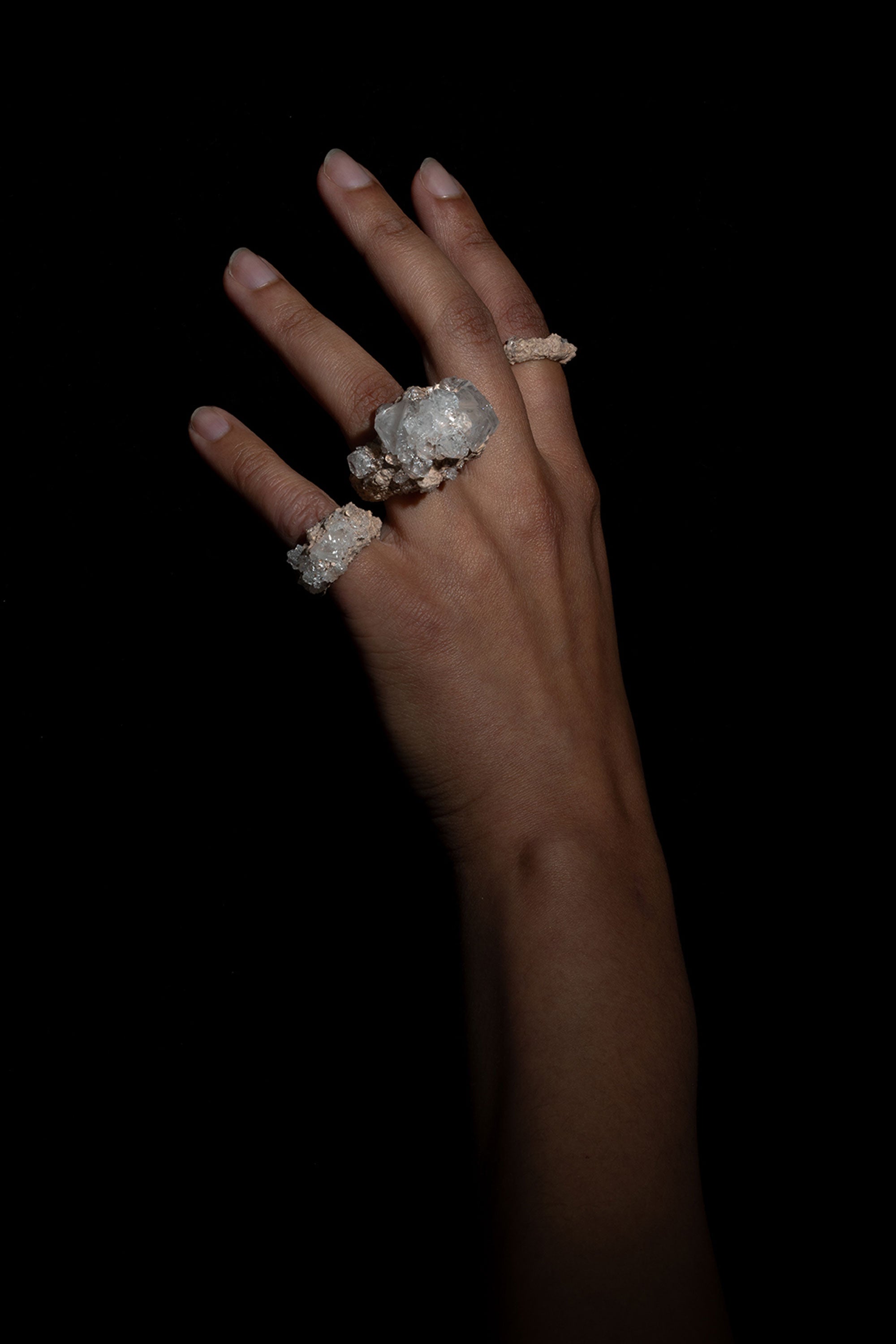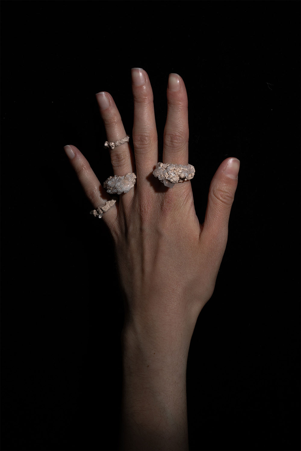 "More than adornments, this collection grows from mutual influence. The pieces emerge from moments where control gives way to collaboration, evolving from hydrogels into crystallised forms. Each one redefines the value of jewellery, shaped through care and patience to embrace the unpredictable beauty of bacterial expressions."