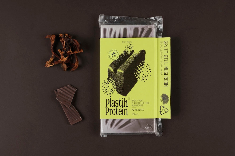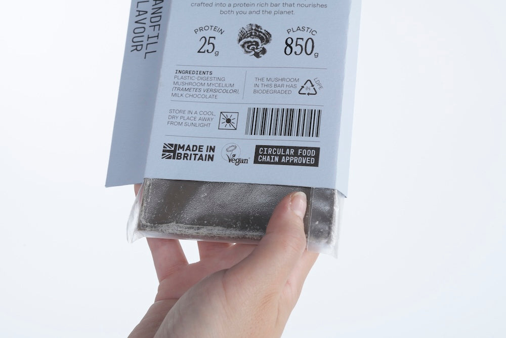 But the chocolate bar does more than deliver protein. Each bar's packaging clearly states which plastic waste the mycelium consumed: PET bottles, polyurethane foam, or plastic film. This transparency creates a direct link between what you're eating and what environmental problem it solves. The act of consumption becomes participation in a cleanup effort.