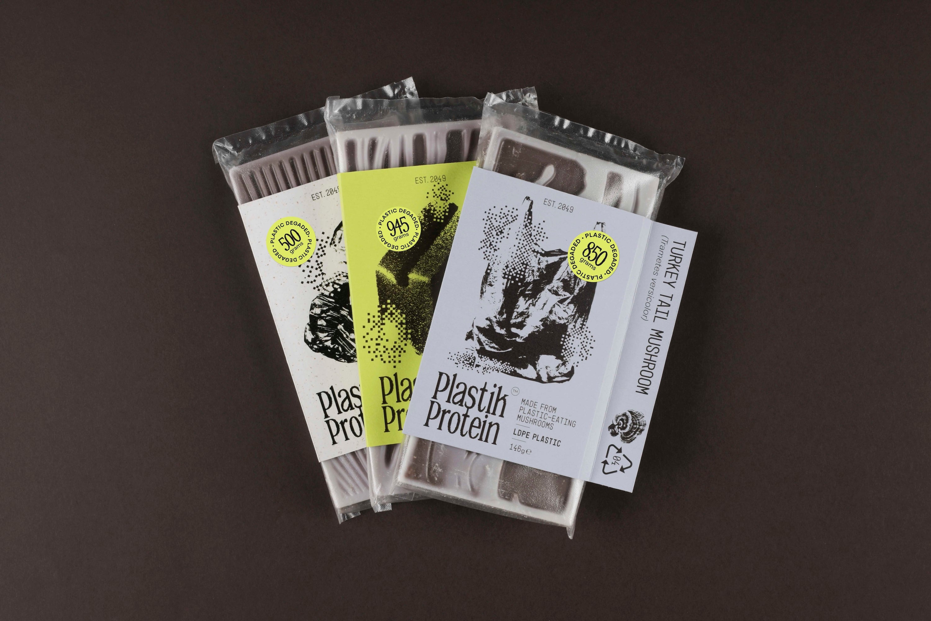 By 2049, we might be eating the plastic crisis. Odette Dierkx's Plastik Protein project imagines bioengineered fungi that consume PET bottles, polyurethane foam, and plastic bags, converting plastic waste into edible mycelium protein. The delivery format: chocolate bars, each labelled with the specific waste stream it remediated.