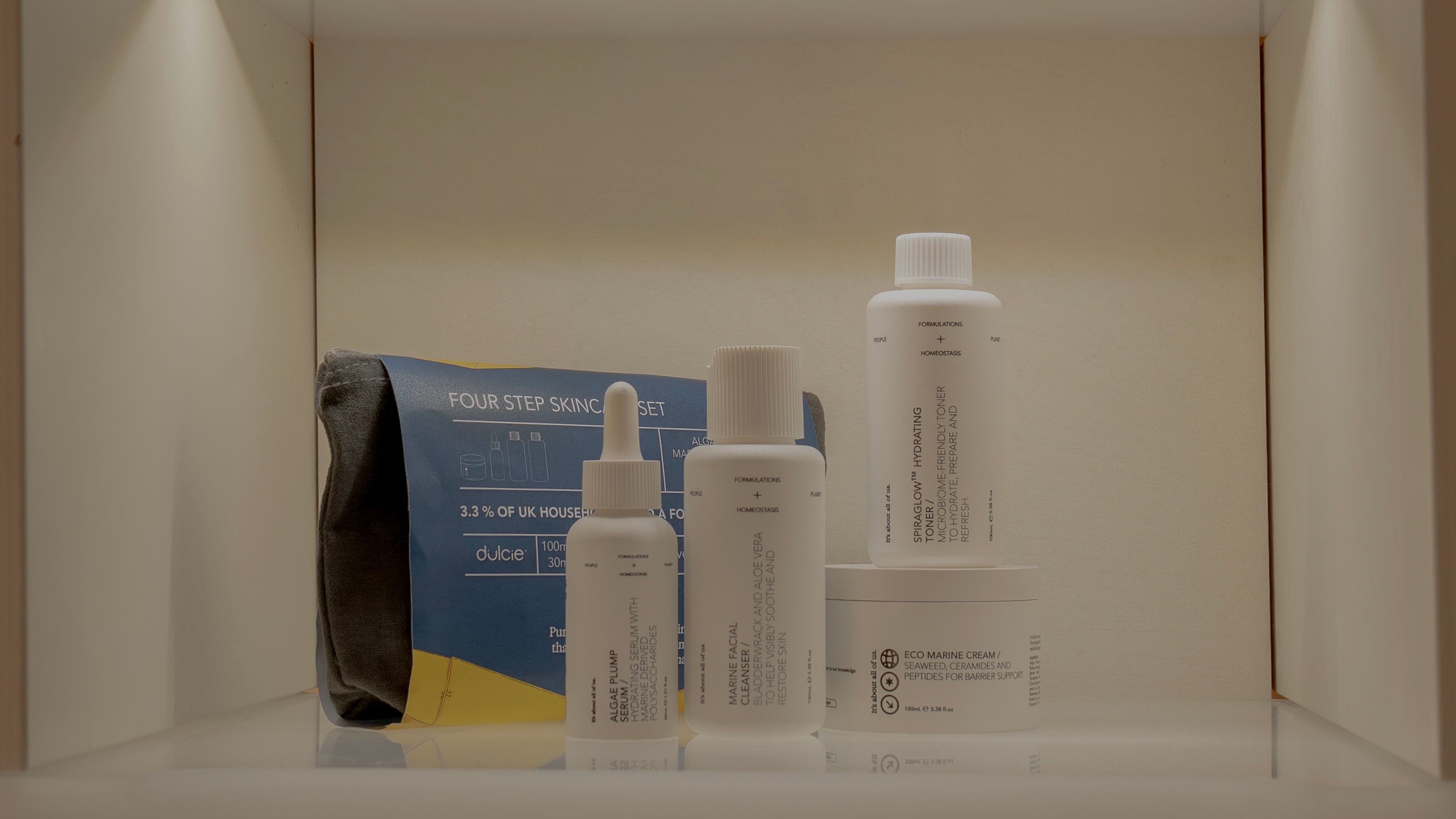 Our symbiotic skincare suite. Set includes: Marine Facial Cleanser, Spiraglow™ Hydrating Toner, Algae Plump Serum and Eco Marine Cream. Housed in a recycled cotton wash bag, hand-dyed with Terminalia extract. With each gift set you purchase we donate a portion to our local foodbank to help provide meals to those who need it.