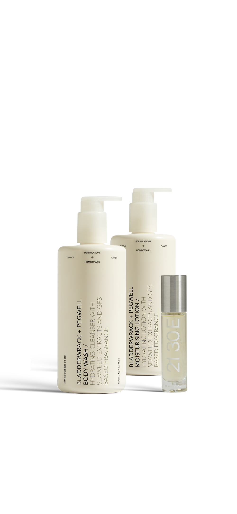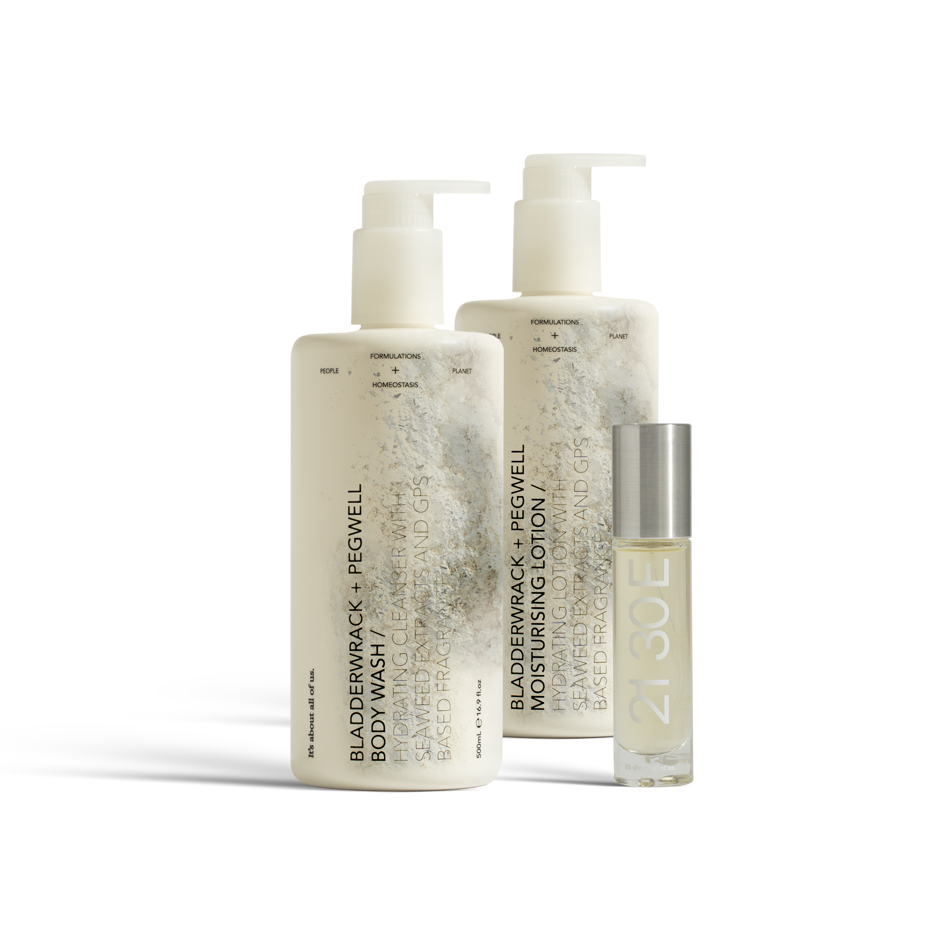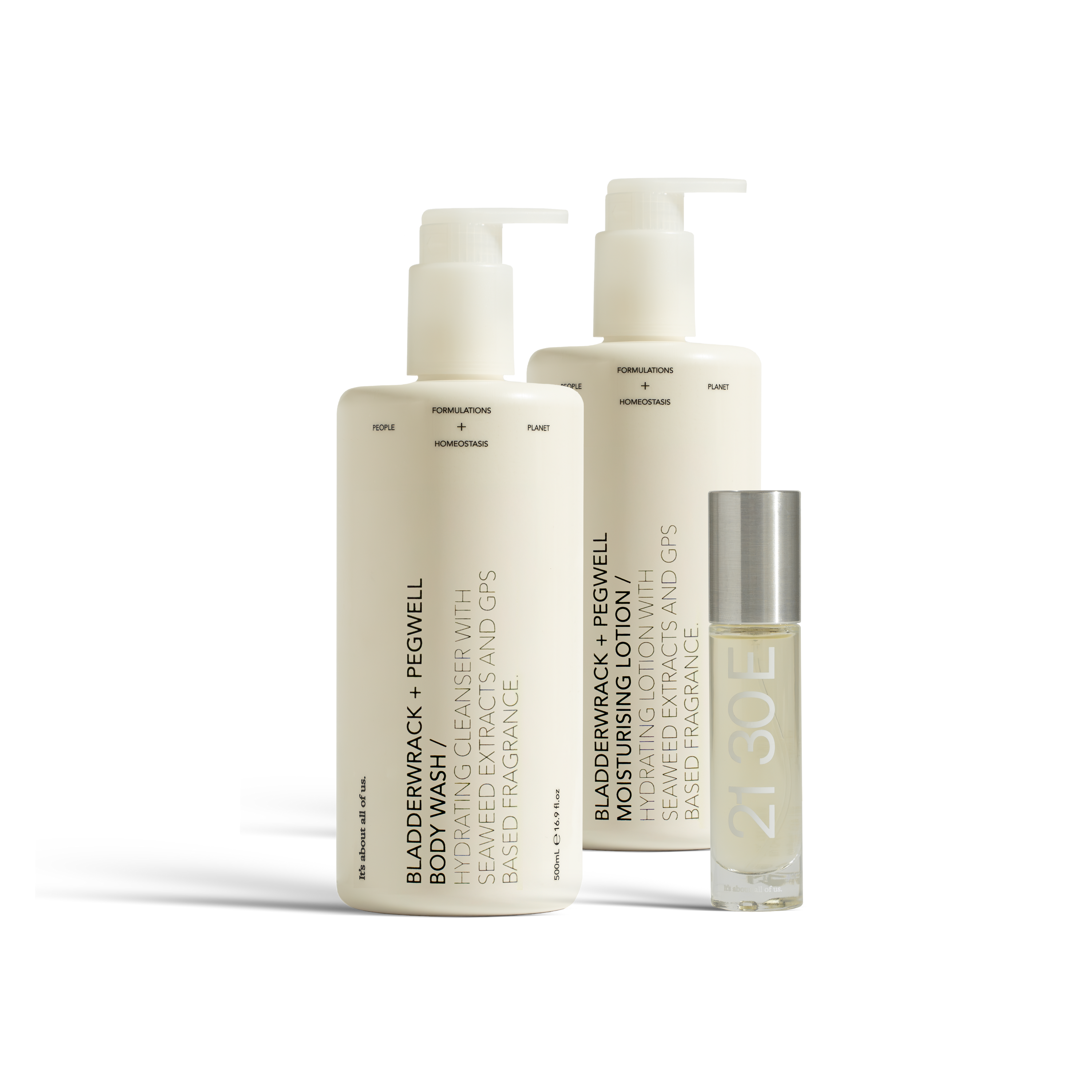 A bundle containing our new Bladderwrack + Pegwell Body Wash, Moisturising Lotion and miniature parfum.