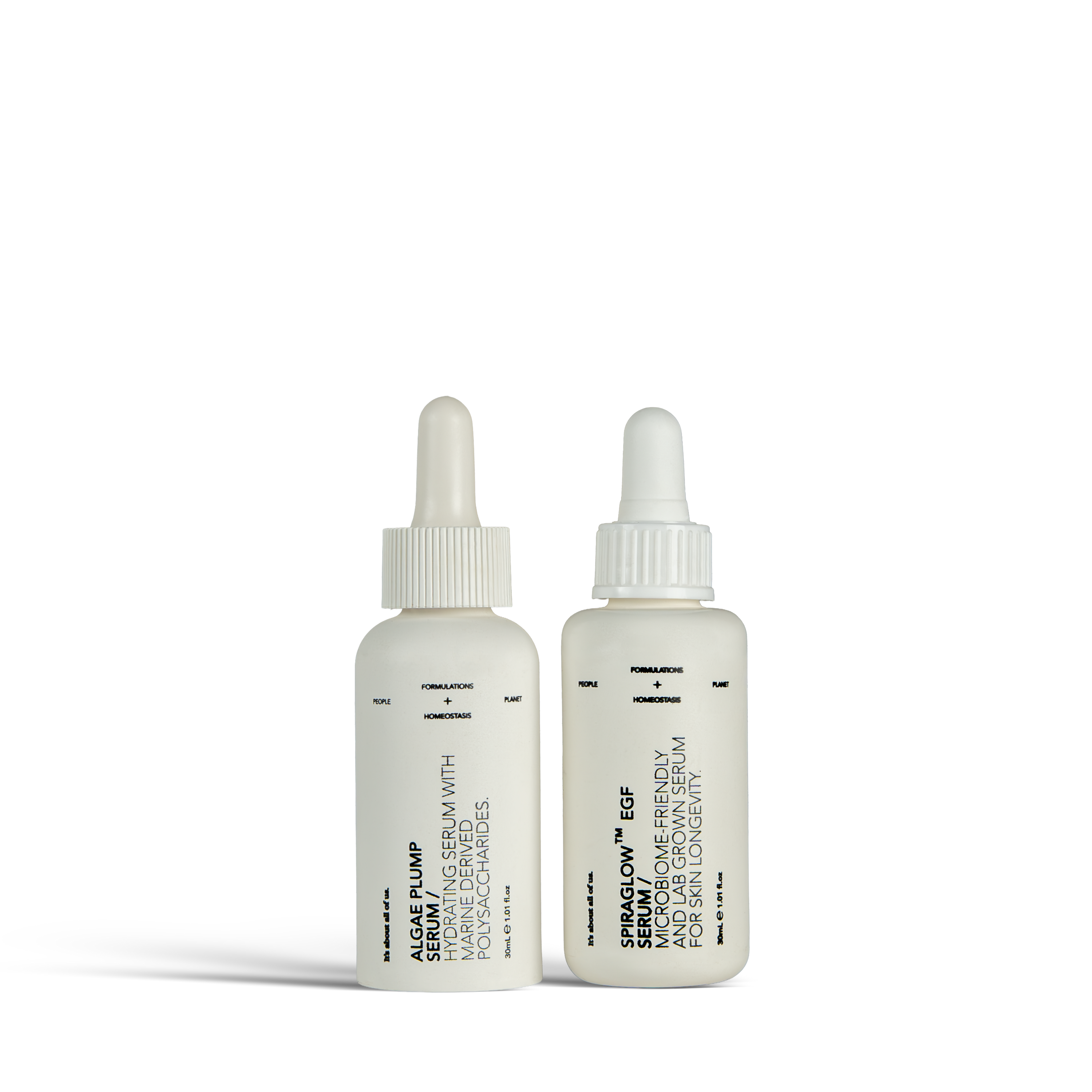 A duo our team swears by. Together they hydrate, plump, and repair for dewy, resilient skin. Offered at a special price based on learnings from our Pay What You Feel campaign: this bundle includes our best-selling Algae Plump Serum at half price, alongside our Spiraglow™ EGF Serum.